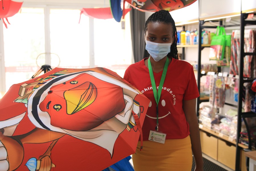 A staff member shows a product in “Let’s go China” exhibition hall at Kigali City Tower in Kigali, Rwanda, Sept. 9, 2021. (Photo/Xinhua)