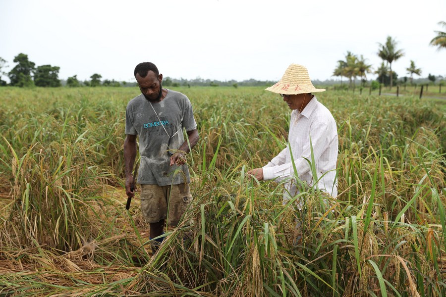 Chinese expert checks the rice plants flattened by heavy downpours at a demonstration field of China-Aid Agricultural Development Project on rice planting in Nausori, Fiji, Mar. 13, 2024. (Photo/Xinhua)