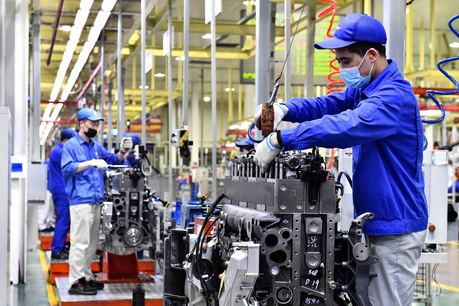 Workers assemble engines on an assembly line at a workshop of the Weichai Power Co., Ltd. in Weifang City, east China’s Shandong province, Apr. 22, 2021. (Photo/Xinhua)
