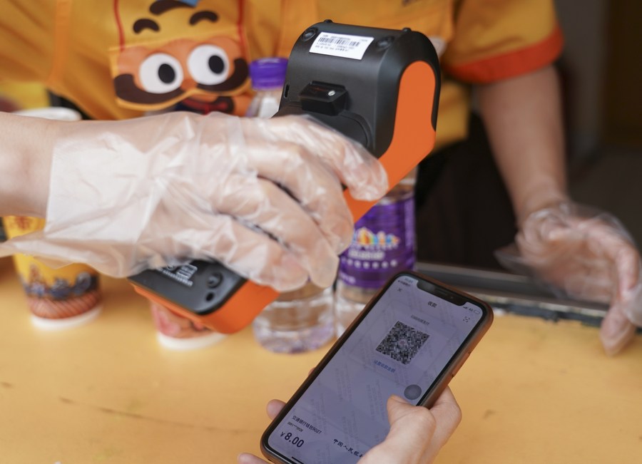 A staff member receives money from a tourist using digital RMB with a POS reader at the Happy Valley Beijing theme park in Beijing, capital of China, Jun. 16, 2021. (Photo/Xinhua)