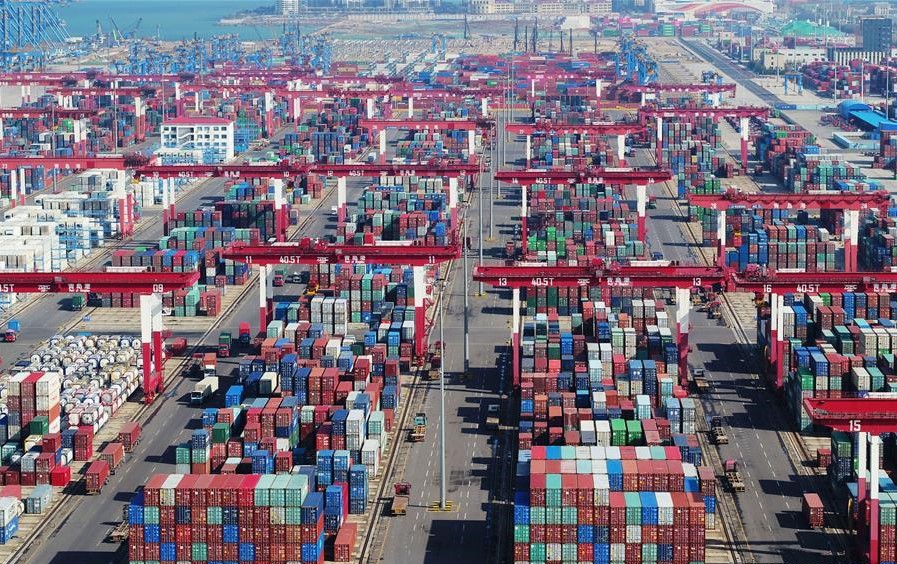 Containers and trucks are seen at a terminal of the Qingdao port in Shandong province, China, on Nov. 8, 2018. (Photo/Xinhua)