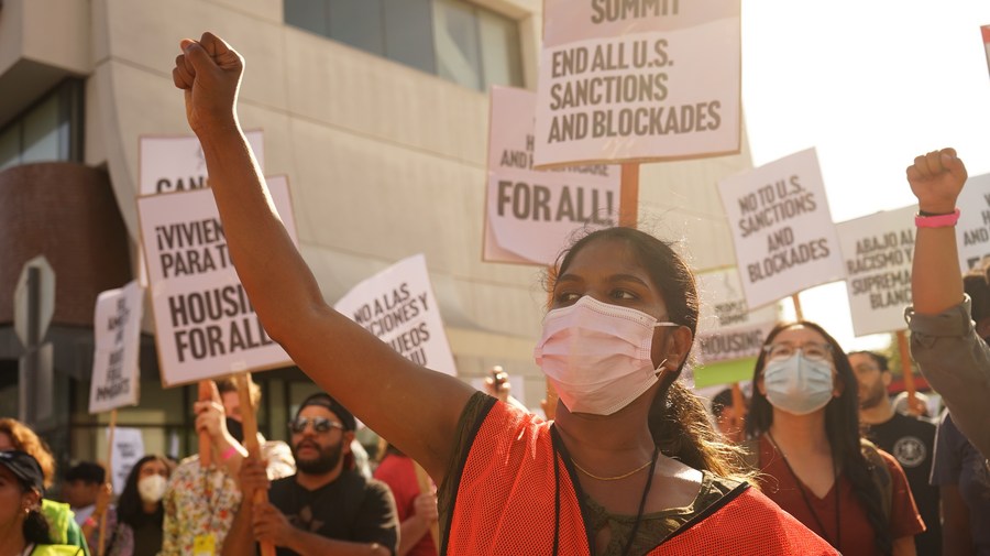 People protest against U.S. foreign policy in Los Angeles, the United States, Jun. 10, 2022. (Photo/Xinhua)