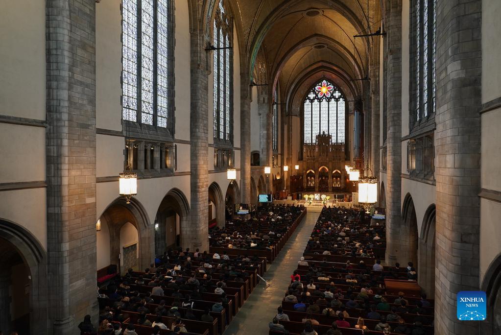 Photo taken on Nov. 18, 2021 shows the scene of a memorial service for Zheng Shaoxiong in Chicago, the United States. The University of Chicago (UChicago) hosted on Thursday afternoon a memorial service for Zheng Shaoxiong, a Chinese student who just graduated from UChicago and was killed in a robbery near the campus. (Jason Smith/University of Chicago/Handout via Xinhua)