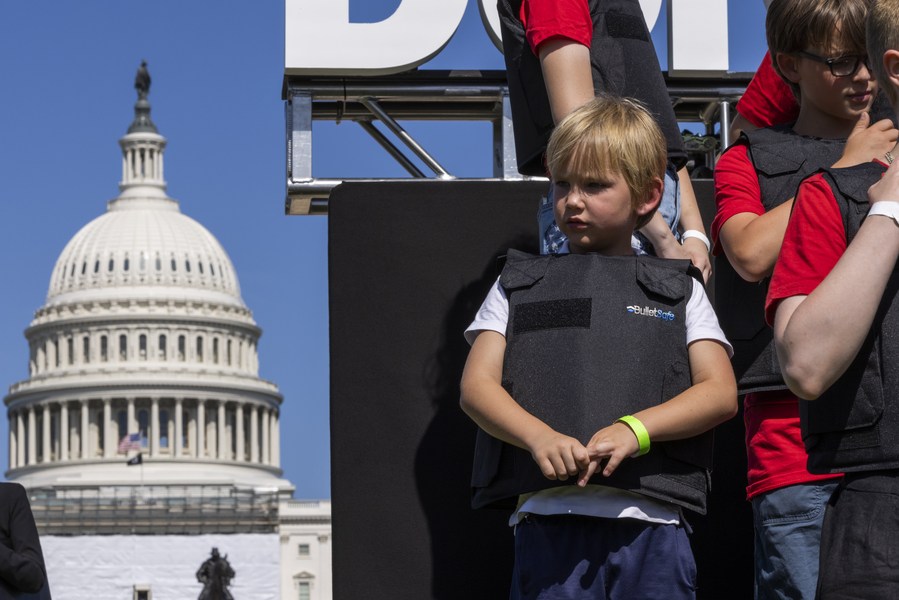 Students wearing bulletproof vests hold a rally near the Capitol Reflecting Pool in Washington, D.C., the United States, Jun. 6, 2022. (Photo/Xinhua)