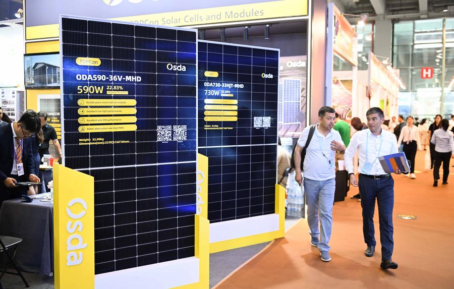 Overseas purchasers walk past a booth exhibiting solar battery products during the 135th session of the China Import and Export Fair in Guangzhou, south China’s Guangdong Province, April 15, 2024. (Photo/Xinhua)