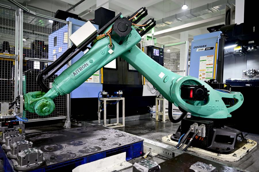 A robot processes hydraulic motors at the intelligent manufacturing industrial park of Eddie Precision Machinery Co., Ltd. in Yantai, east China’s Shandong Province, Dec. 27, 2023. (Photo/Xinhua)
