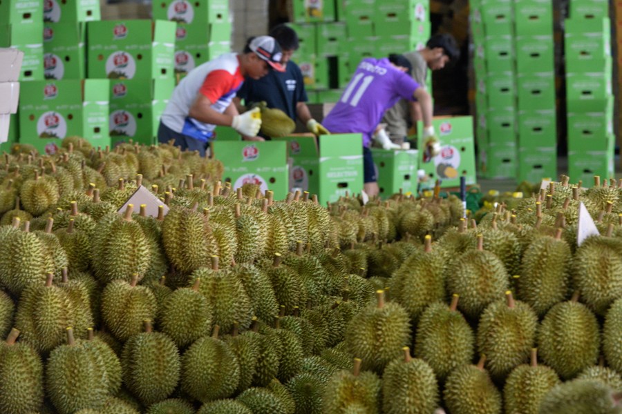 Workers pack durians at a durian processing factory in Chanthaburi, Thailand, May 7, 2024. (Photo/Xinhua)