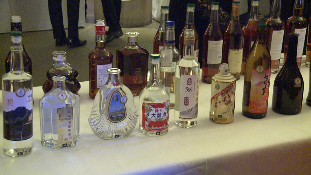 Different brands of Chinese Baijiu are on show at Guildhall in the City of London, Nov. 14, 2018. (Photo/CGTN)
