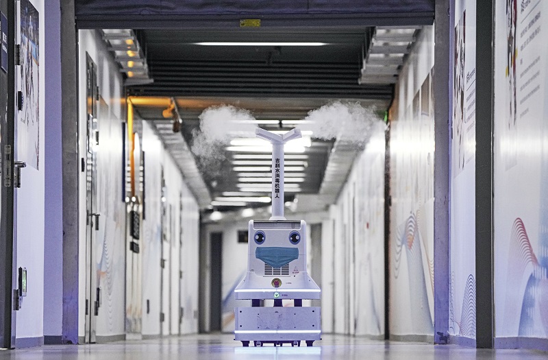 A Geely disinfection robot cruises around the Beijing National Stadium on Dec. 2, 2021.