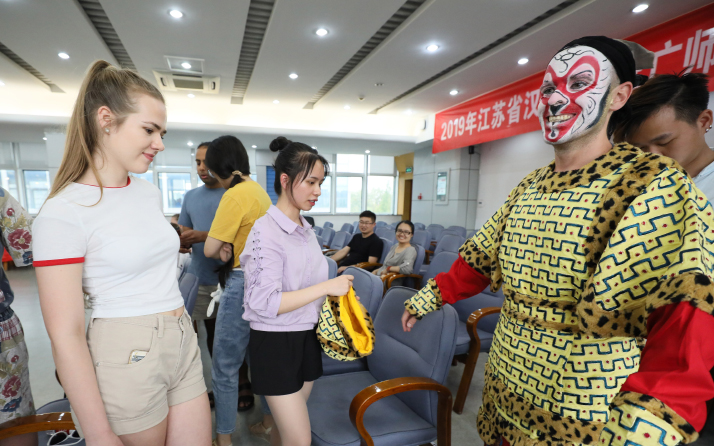 A British student checks out a traditional Chinese opera costume in Zhenjiang City, east China’s Jiangsu Province, on July 10 (XINHUA)