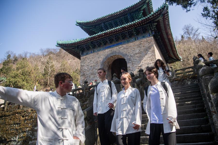Members of a delegation of high school students from the U.S. state of Washington visit Wudang Mountain, a sanctuary for the Taoism martial art, in central China’s Hubei Province, Mar. 22, 2024. (Photo/Xinhua)