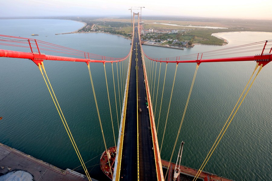File photo taken on May 10, 2018 shows the aerial view of the Chinese-built Maputo Bridge in Maputo, Mozambique. (Photo/Xinhua)