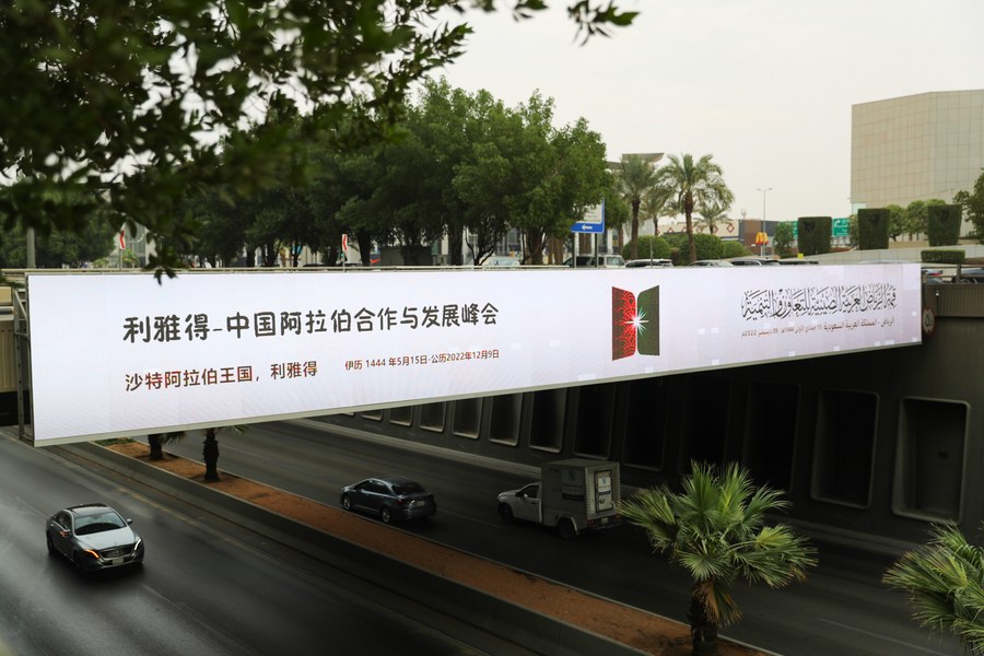 This photo shows a screen display about the China-Arab States Summit on a street in Riyadh, Saudi Arabia, Dec. 7, 2022. (Photo/Xinhua)