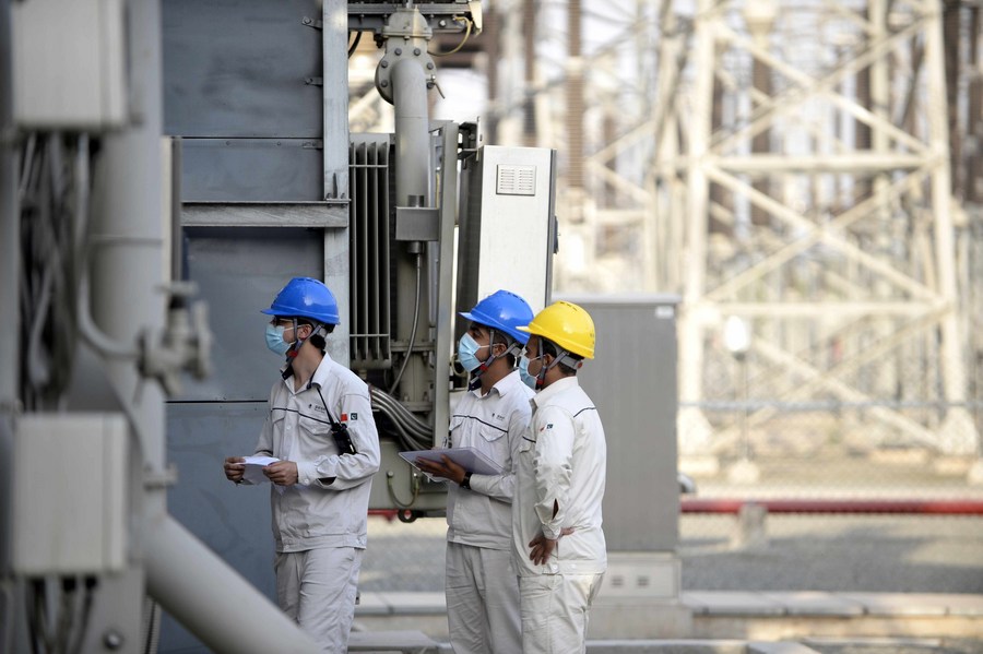 Technicians work at the Lahore Converter Station of the ±660kV Matiari-Lahore high-voltage direct current (HVDC) transmission line project under the China-Pakistan Economic Corridor (CPEC) on the outskirts of Lahore, in Pakistan’s eastern Punjab province on May 25, 2022. (Photo/Xinhua)