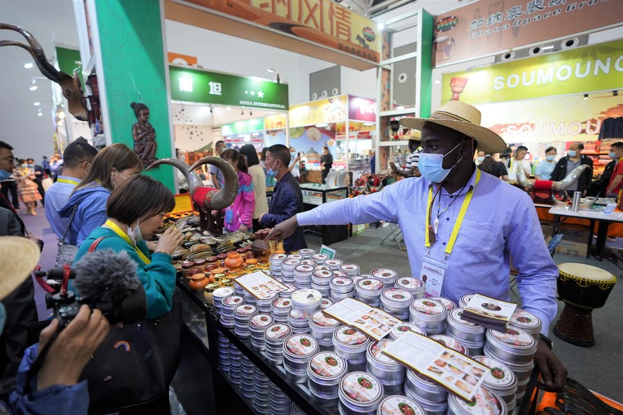 An exhibitor (1st R) introduces his products at the Fifth Silk Road International Exposition in Xi’an, capital of northwest China’s Shaanxi Province, May 11, 2021. (Photo/Xinhua)