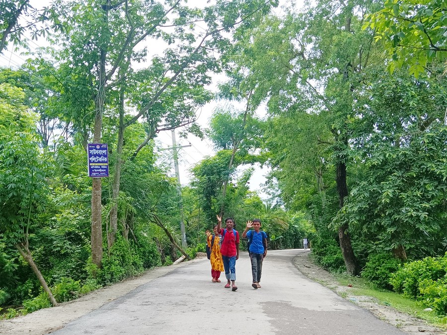 Children walk on a widened and reconstructed bituminous road at a village in Barguna, Bangladesh, on Jul. 26, 2022. (Photo/Xinhua)
