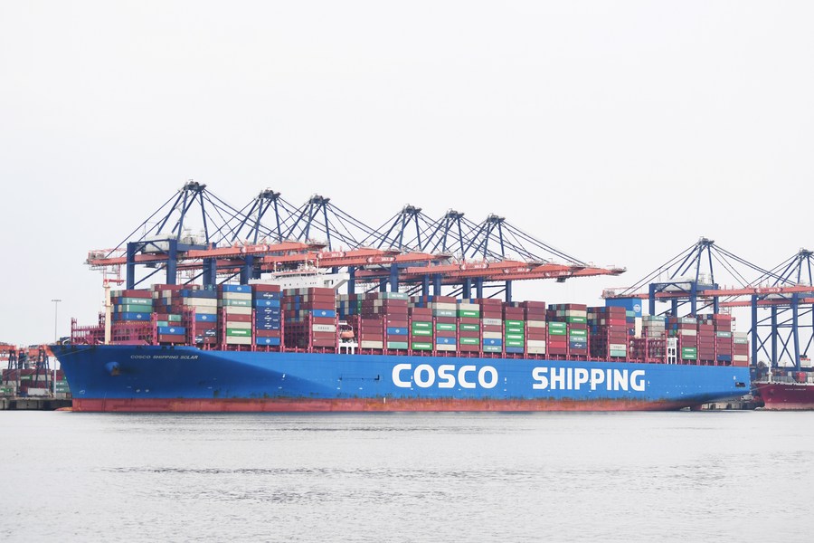 A container ship of China’s COSCO Shipping docks at the Port of Rotterdam, the Netherlands, May 1, 2023. (Photo/Xinhua)