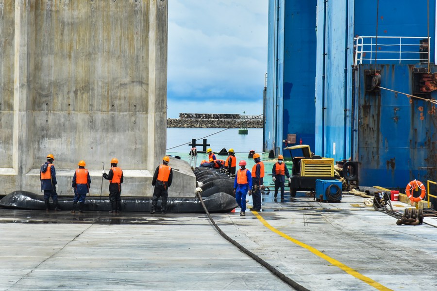 This photo taken on Oct. 22, 2022 shows technicians working to install the first caisson of phase II construction of the Kribi Deep Seaport in Kribi, Cameroon. (Photo/Xinhua)