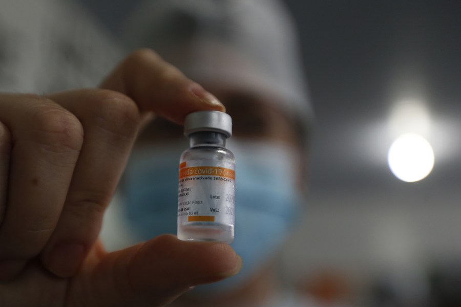 The vaccine developed by Chinese laboratory Sinovac in collaboration with the Butantan Institute of Sao Paulo is displayed in the city of Tabatinga in the state of Amazonas, Brazil, Jan. 19, 2021. (Photo/Xinhua)