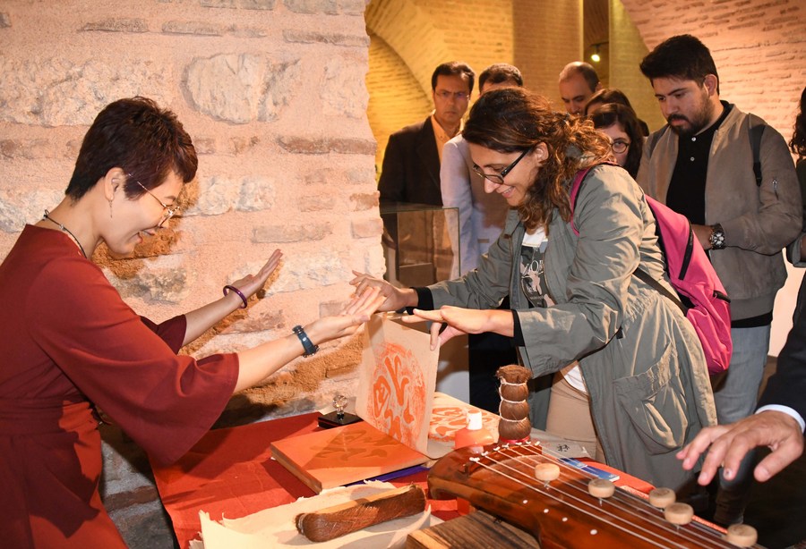 A visitor (R) tries woodblock printing during the Belt and Road Shanghai Intangible Cultural Heritage Exhibition at the Museum of Turkish and Islamic Arts in Istanbul, Turkey, Oct. 18, 2019. (Photo/Xinhua)