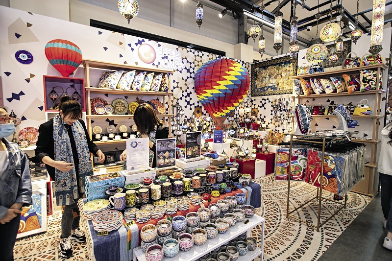 An import commodity exhibition in Shanghai displays nearly 10,000 special products from 40 countries and regions around the world, creating an immersive culture and shopping experience for locals and tourists. Visitors are trying on scarves at the Turkish booth, on May 1, 2021.