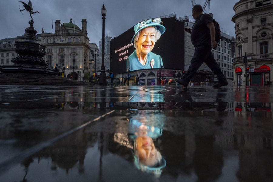 A screen commemorating Britain’s Queen Elizabeth II is seen in London, Britain, on Sept. 9, 2022. (Photo/Xinhua)