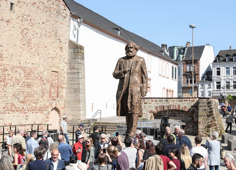 File photo shows visitors gather in front of the Karl Marx statue in Trier, Germany. (Photo/Xinhua)