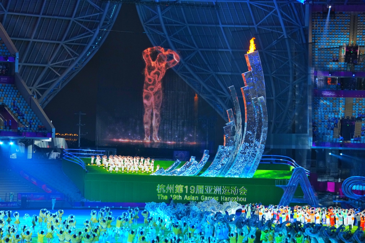 The digital torchbearer makes a hand heart gesture to the audience at the closing ceremony of the 19th Asian Games at the Hangzhou Olympic Sports Center Stadium in Hangzhou, East China’s Zhejiang province. (Photo/China Daily)