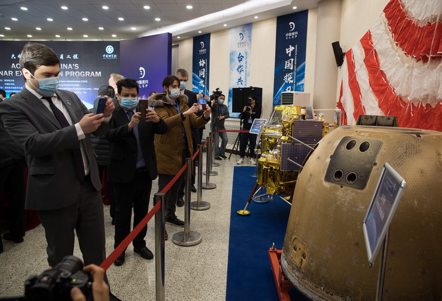 Diplomats and representatives from foreign countries and international organizations view the Chang’e-5 lunar mission-related devices and models at the National Astronomical Observatories of China under the Chinese Academy of Sciences in Beijing, capital of China, Jan. 18, 2021. (Photo/Xinhua)