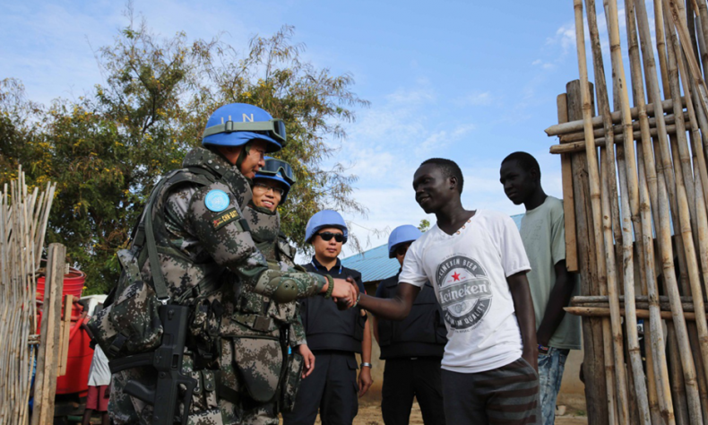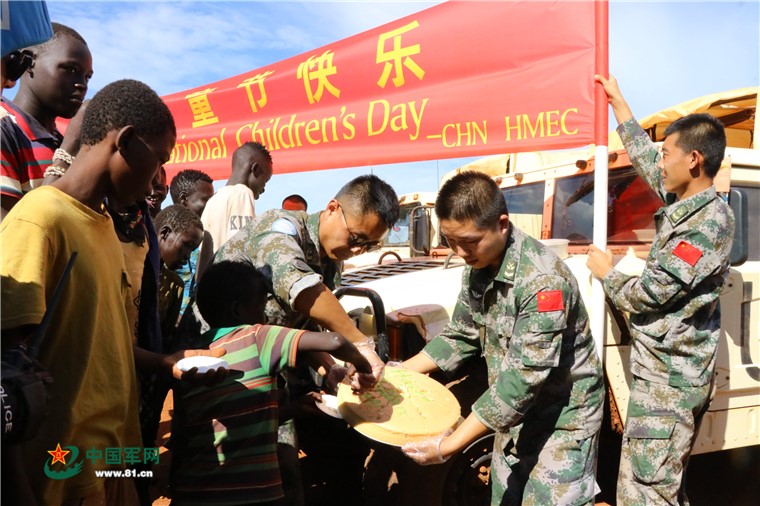 Δ Soldiers of China’s eighth batch of troops to South Sudan Peacekeeping Corps of Engineers condole local children in International Children’s Day.