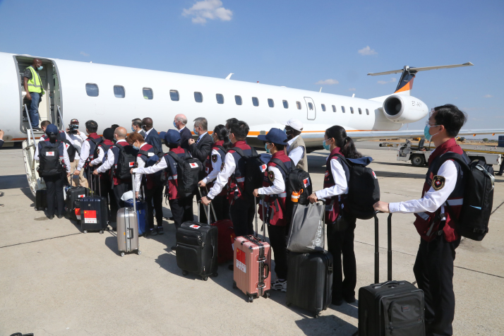 Chinese medical workers board a plane in Harare, Zimbabwe, bound for Equatorial Guinea to offer assistance in novel coronavirus disease treatment after finishing their work in Zimbabwe, on May 25 (Photo/Xinhua)