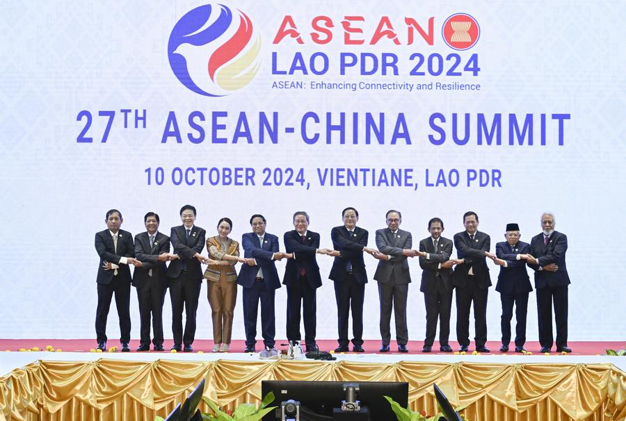 Chinese Premier Li Qiang poses for a group photo before the 27th China-ASEAN Summit in Vientiane, Laos, Oct. 10, 2024. (Photo/Xinhua)