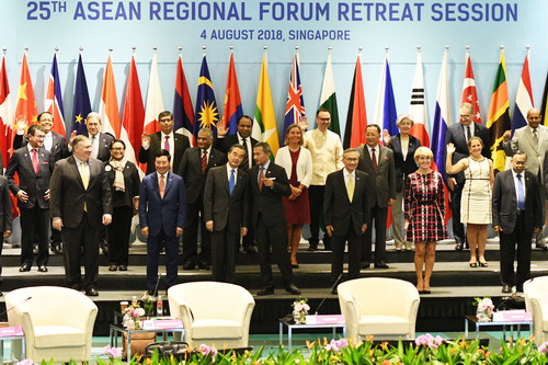 Δ? Chinese State Councilor and Foreign Minister Wang Yi (First row, L3) attends the 25th ASEAN Regional Forum retreat held in Singapore on Aug 4, 2018.[Photo/ Xinhua]
