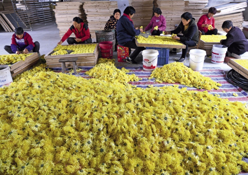 Farmers in Yulin Village of Shouxian County, Huainan City in Anhui Province reap a bumper harvest of golden chrysanthemum, a part of their effort to win the battle against poverty.