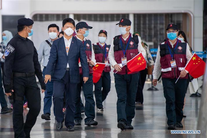 An anti-COVID-19 medical team from China to Malaysia is received by Chinese Ambassador to Malaysia Bai Tian (second left, front) at the Kuala Lumpur International Airport on April 18 (Photo: Xinhua)