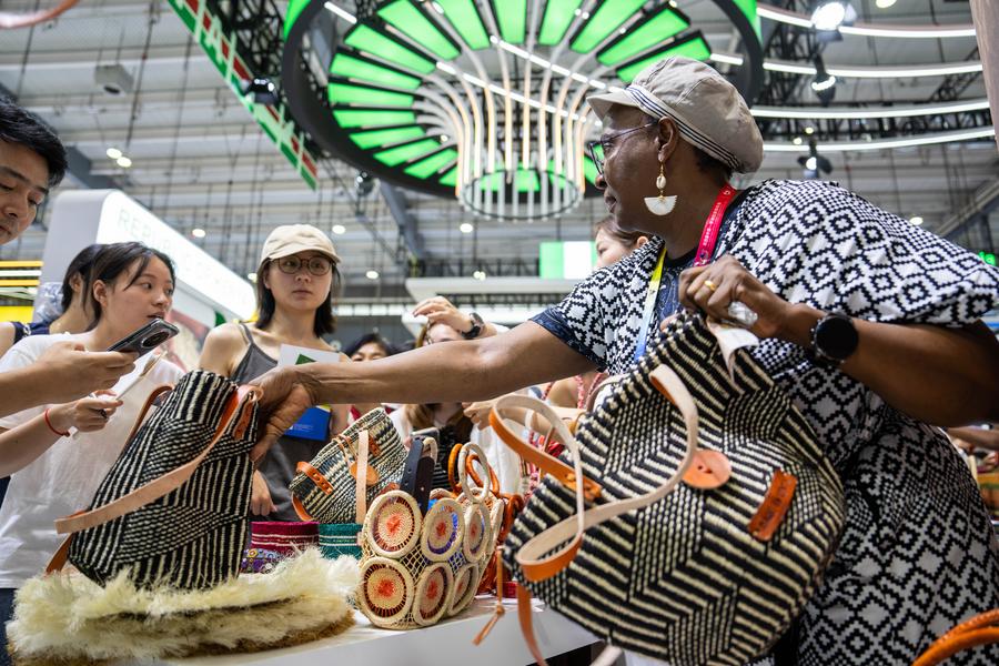 An exhibitor (R) introduces African products to visitors during the fourth China-Africa Economic and Trade Expo at Changsha International Convention and Exhibition Center in Changsha, central China’s Hunan Province, Jun. 13, 2025. (Photo/Xinhua)