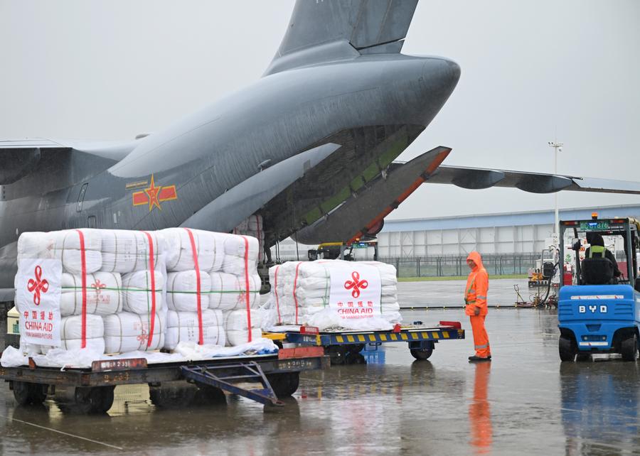 Staff members load flood relief supplies provided by the Chinese government to Pakistan at Zhengzhou Xinzheng International Airport in Zhengzhou, central China’s Henan Province, Sept. 27, 2025. (Photo/Xinhua)