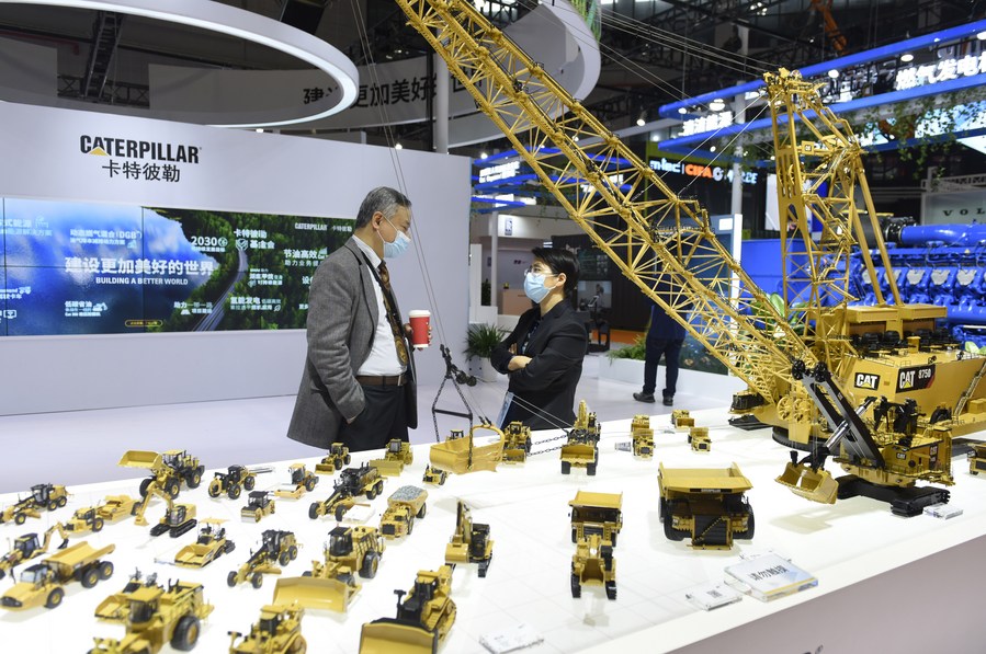Visitors talk with each other at the Caterpillar booth during the fourth China International Import Expo (CIIE) in Shanghai, east China, Nov. 5, 2021. (Photo/Xinhua)
