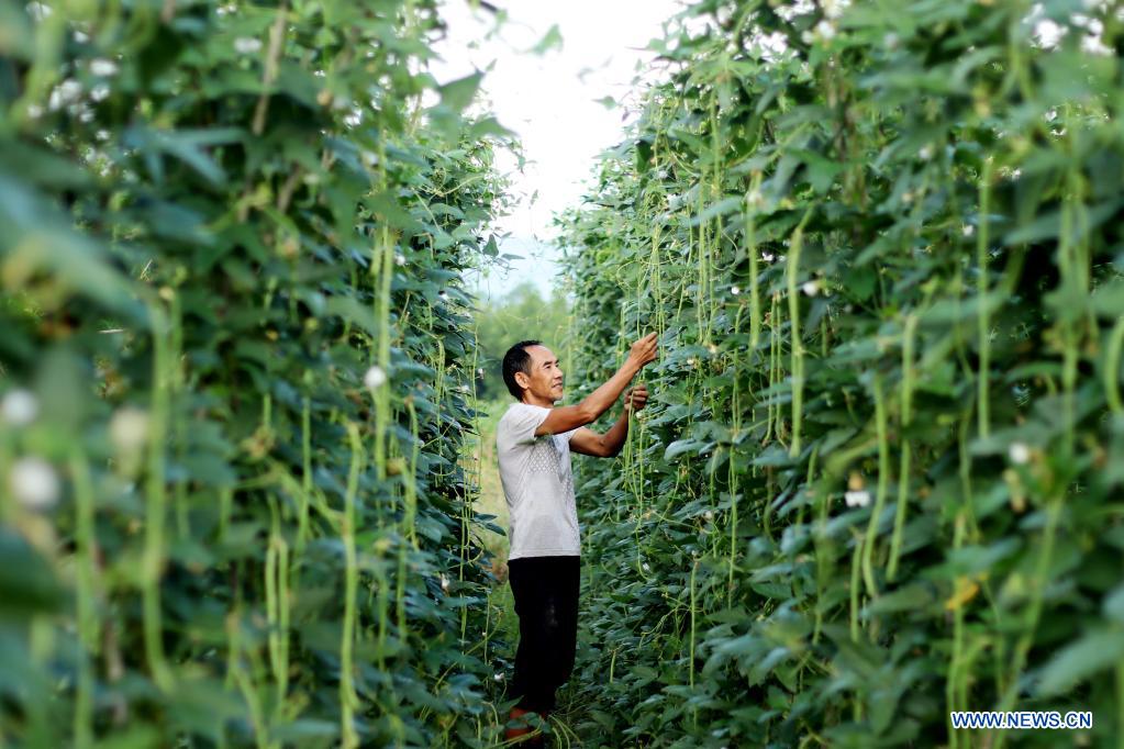 A farmer harvests beans in Housheng village in Lianyuan city, Central China’s Hunan province, Aug 23, 2021. (Photo/Xinhua)