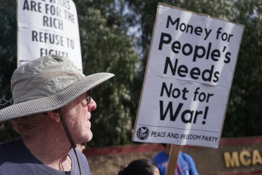 A protester is seen in front of Marine Corps Air Station Miramar, 25 kilometers north of downtown San Diego, California, the United States, Mar. 18, 2023. (Photo/Xinhua)
