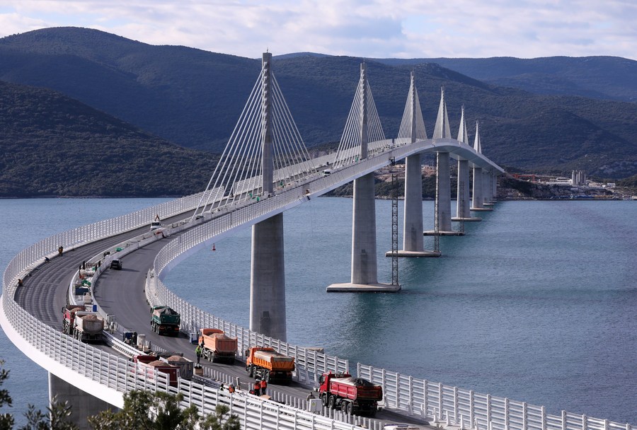 Photo taken on Jan. 21, 2022 shows trucks arriving at the construction site of Peljesac Bridge, the largest infrastructure project in Croatia undertaken by a Chinese consortium, for its load strains test in Komarna, Croatia. (Photo/Xinhua)