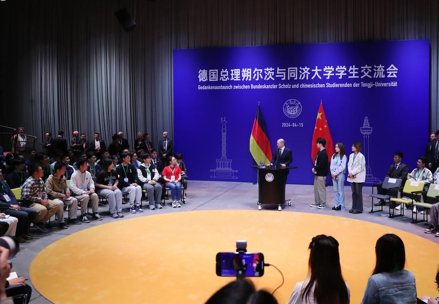 Federal Chancellor of Germany Olaf Scholz takes part in a dialogue with students at Tongji University’s Jiading Campus in east China’s Shanghai, Apr. 15, 2024. (Photo/Xinhua)