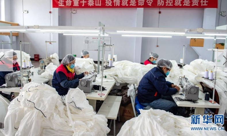 A protective clothing manufacturer in Handan, Hebei Province gears up its productions on February 6 to meet the rising demands for medical protective suits during the period of this raging epidemic.