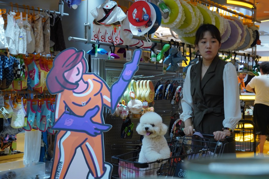 A pet owner shops with her pet at Marsmart pet store in THE BOX Youth Energy Center in Chaoyang District of Beijing, capital of China, Aug. 12, 2023. (Photo/Xinhua)