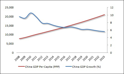 Chinese growth rate is currently positioned to decelerate from 9.6 percent to 5.6 percent between 2008 and 2023. Despite this deceleration, living standards will almost double. In 2008, Chinese GDP per capita was less than US$7,900. By 2023, it could increase to more than US$21,200.