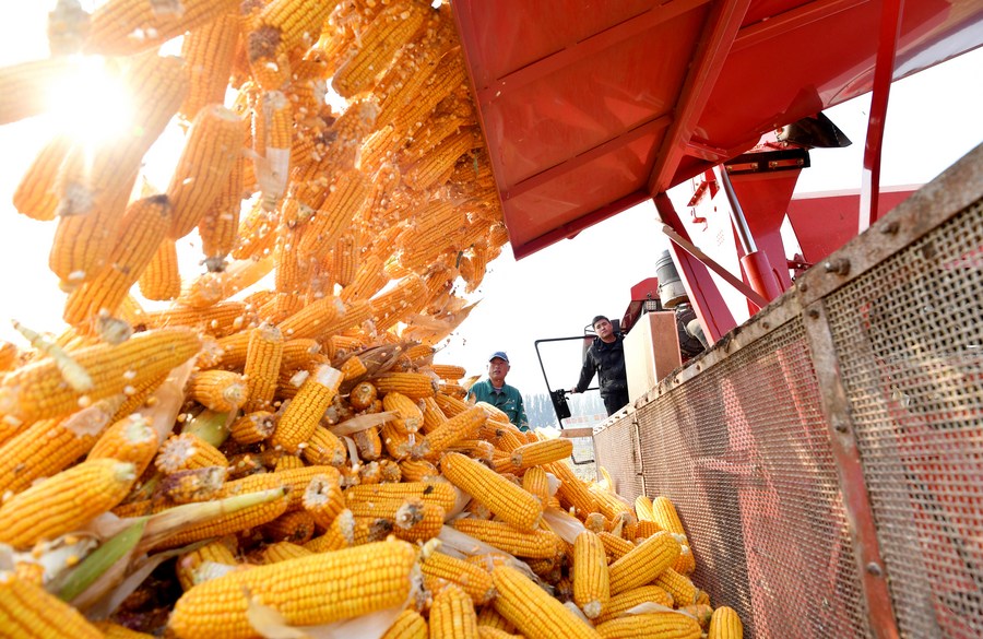 Farmers harvest corns at Zhoujiazhuang Village in Jinzhou City, north China’s Hebei Province, Oct. 8, 2023. (Photo/Xinhua)