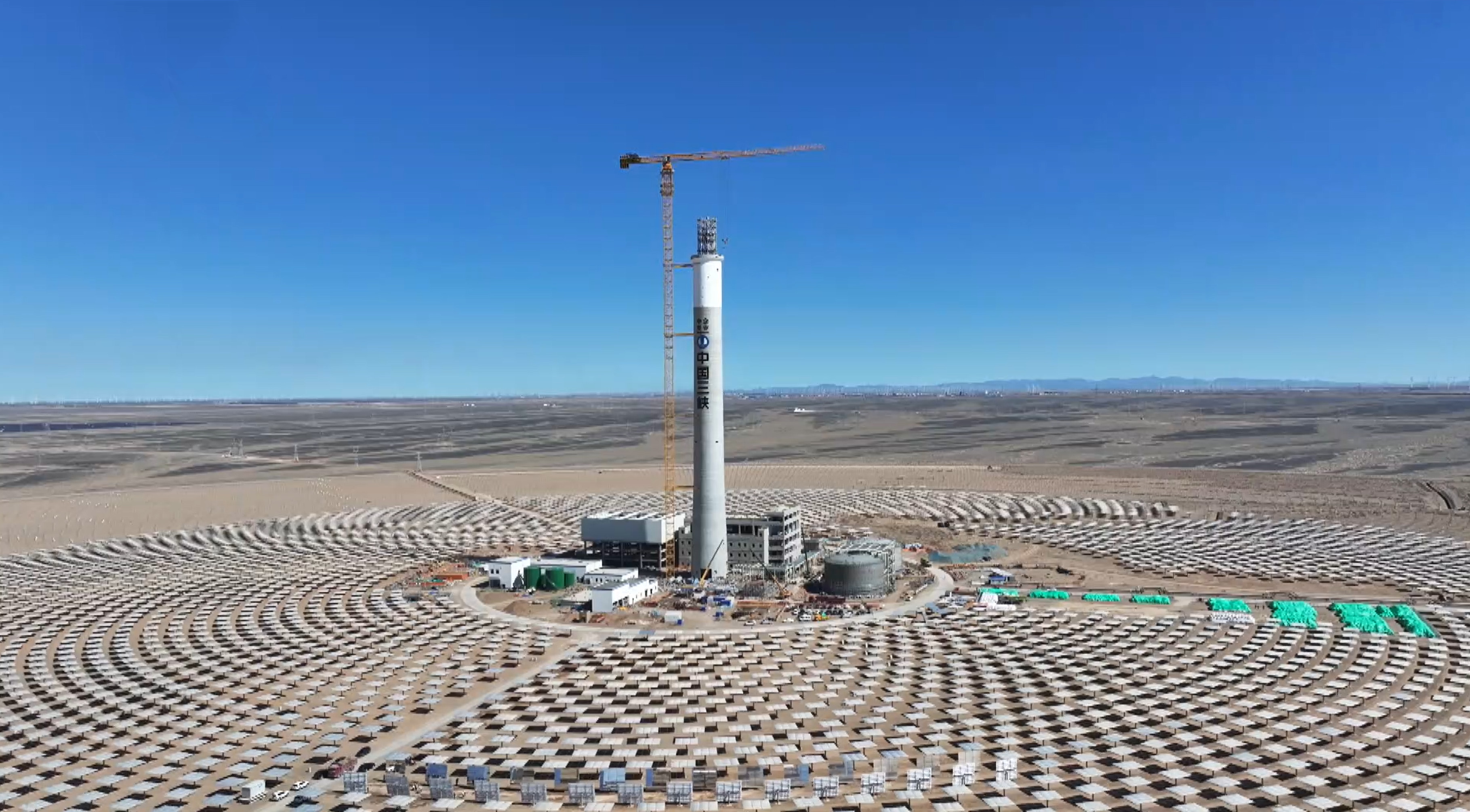 The towers store molten salt, which acts as a thermal battery, retaining extra heat collected during the day and releasing it at night to keep the generators running continuously.