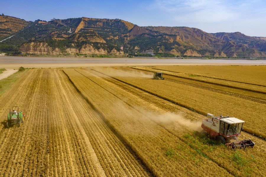 Aerial photo taken on Jun. 5, 2020 shows agricultural machinery harvesting wheat at a cooperative in Sanmenxia City, central China’s Henan Province. (Photo/Xinhua)