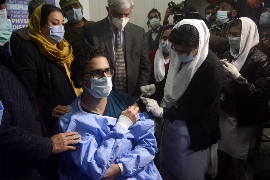 A medical worker receives a dose of COVID-19 vaccine at a hospital in Lahore, capital of Pakistan’s Punjab province on Feb. 3, 2021. (Photo/Xinhua)