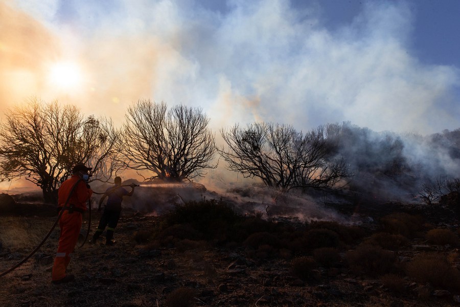 Firefighters battle a wildfire in Keratea, southeast of Athens, Greece, on Aug. 16, 2021. (Photo/Xinhua)